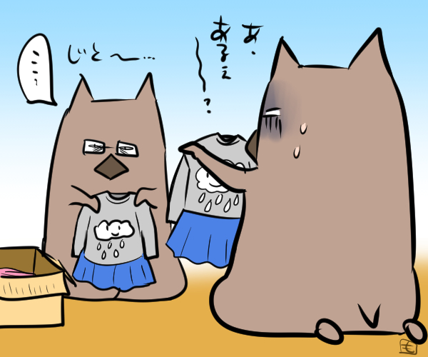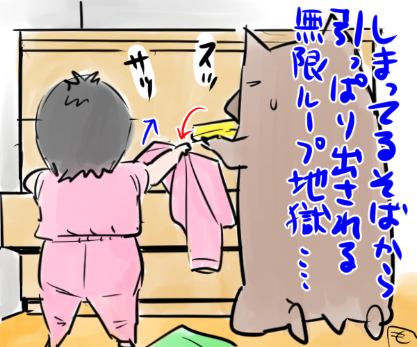 「ダメ!」とかいって無理に引きはがすと大泣きしてそれもまた面倒なことになるので、とりあえず夫の引き出し(最下段)を「さあ、好きなだけだすがよい!」と開放し、娘が夢中になってる隙に部屋から抜け出してTV観てる夫に「なんかゆぴがあなたの引き出し開けて服引っ張り出してたよー」と伝えます。