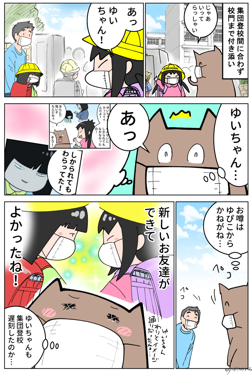 パパと登校してきてたからウチと同じく集団登校に遅れた勢でしょうか(親近感!)。