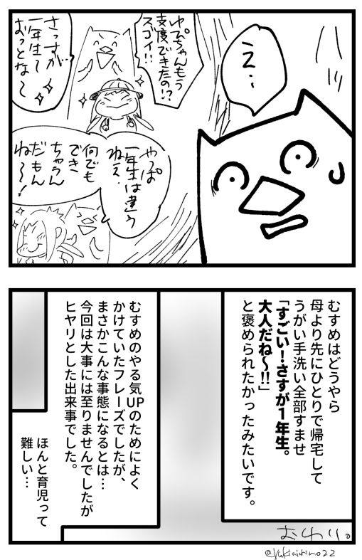 私的には「幼稚園の頃より大人になった」ってニュアンスで言ってたんですけど、むすめは私がいう「大人になった」って言葉を額面通りに受け止めていたようで