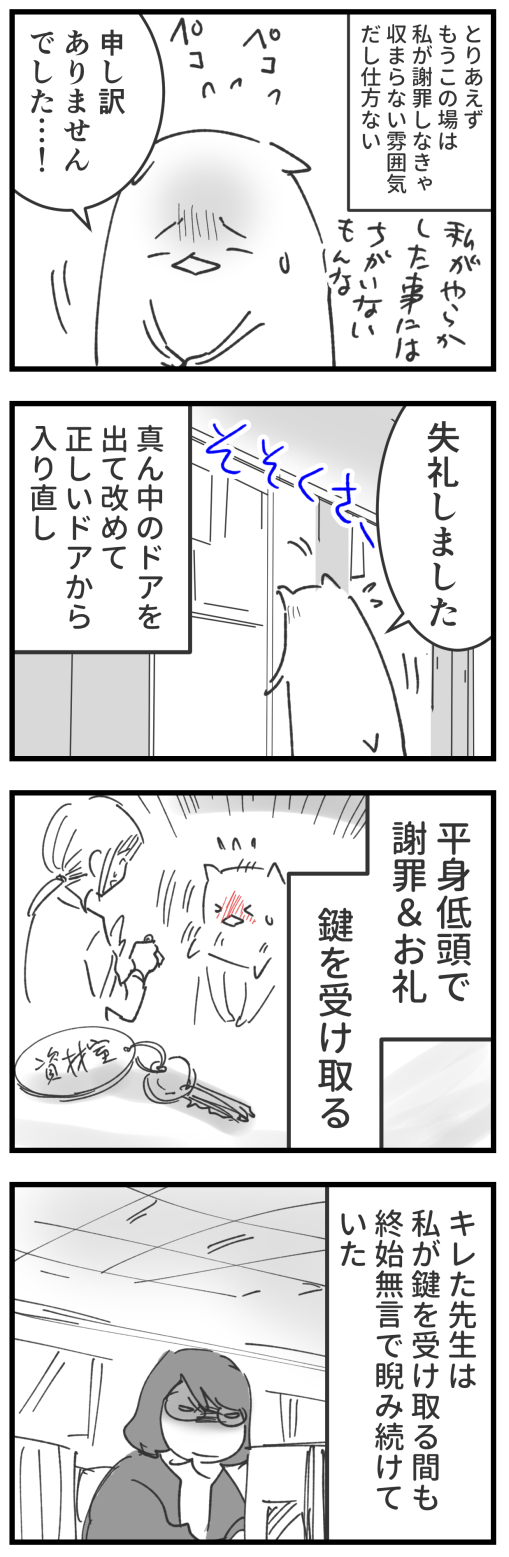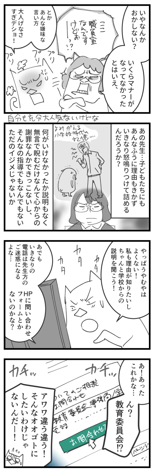 こんにちは。1話目掲載から幾日…「続きは明日」とか書いておいて遅れてすいません。間が空いちゃったんで軽くあらすじ。詳細はリンク先です。<前回>PTA の業務で鍵を受け取りに職員室に行ったら入口を間違えて入室。慌てて出ようとしたら、突然一人の先生がおキレあそばす ...