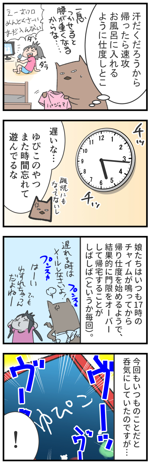 今回はむすめたちが犯罪に巻き込まれたとか事故じゃなかっただけ良かったとします。