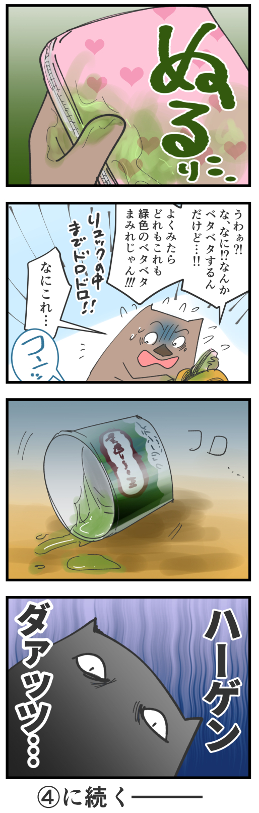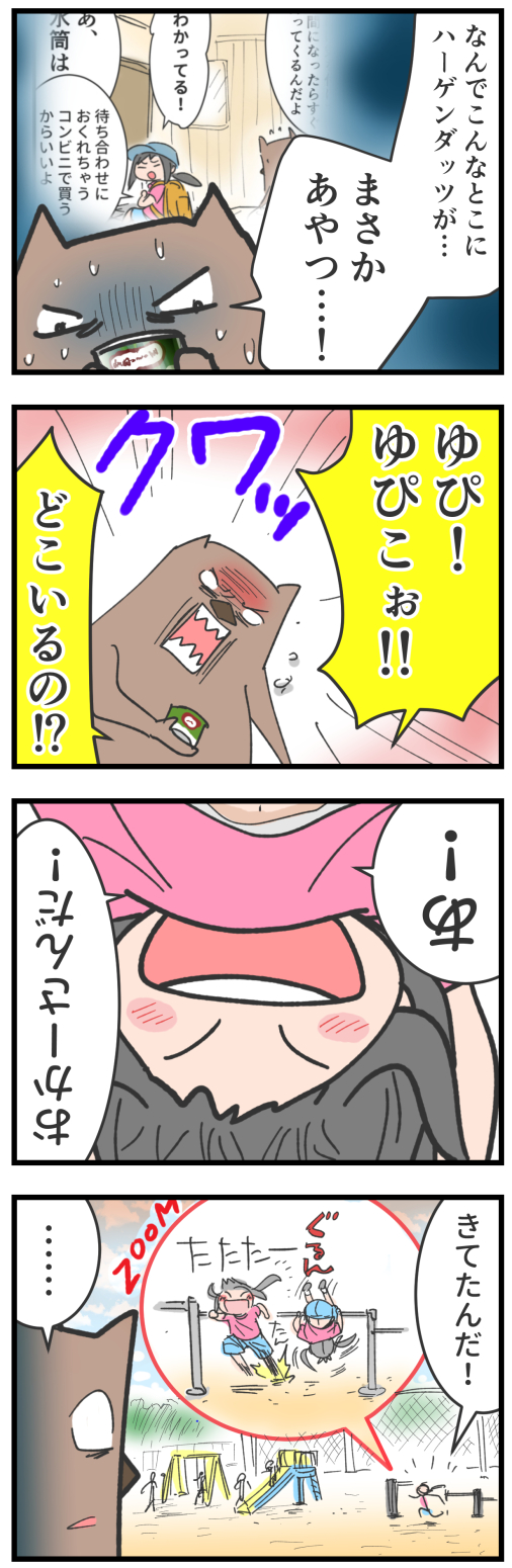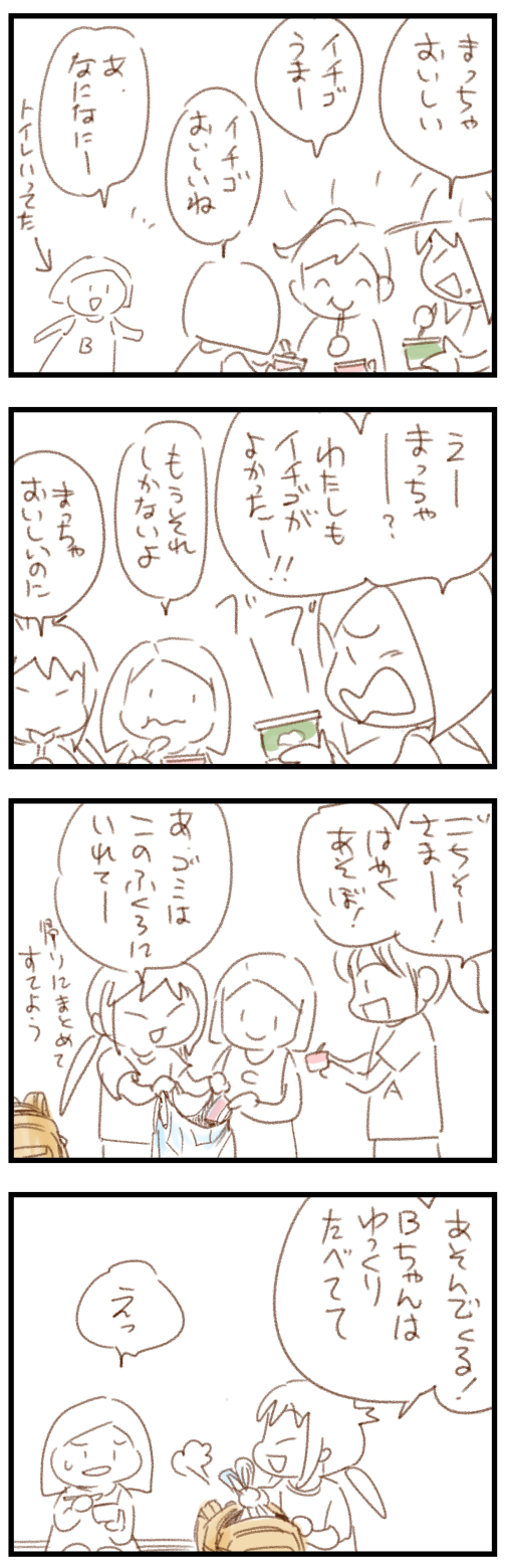 ゆぴこが買ってきたハーゲンダッツをみんなで食べて遊びだしたものの、アイスを持て余してしまったBちゃんはむすめのリュックに入ってた袋に食べかけのアイスごと入れてしまい…
