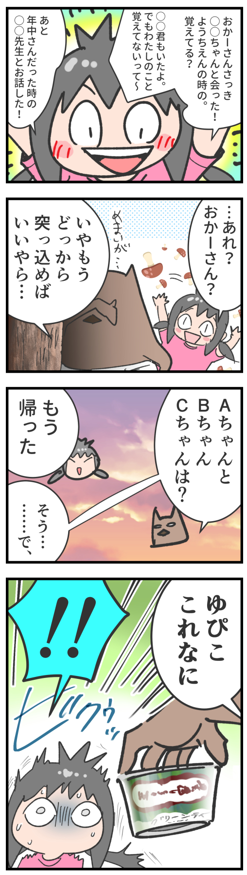 1話でも書きましたが〇公園はむすめがお世話になった幼稚園の横にありまして、フェンス越しに幼稚園の先生とたまにお話とかしてるみたいなんですが数日前にむすめがひとりでまた〇公園にいったらしく、帰宅するなりむすめが