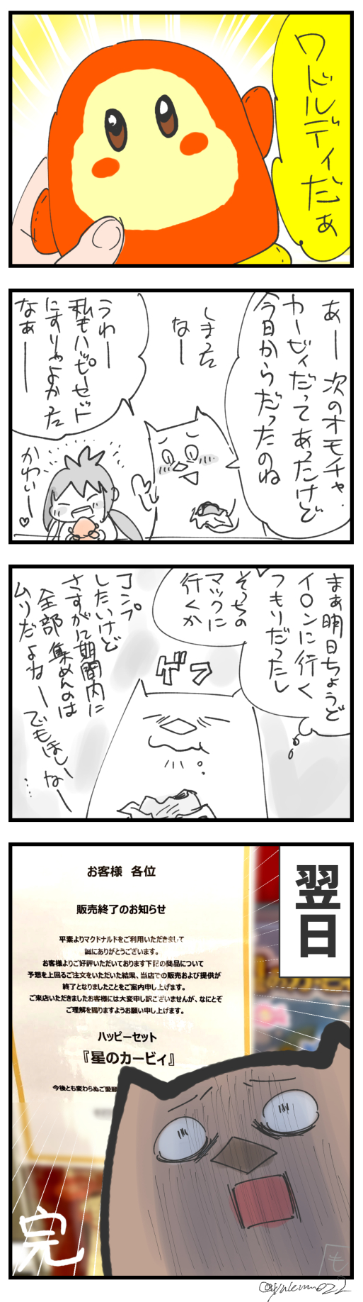 おはようございます。今月23日よりマクドナルドのハッピーセットのオモチャに「星のカービィ」のぬいぐるみが登場しました。発表時「欲しいな~」と思いつつも日々の生活に忙殺されてすっかり忘れてしまっていたんですが、たまたま家族でお出かけしてむすめが「お昼はハッピ ...
