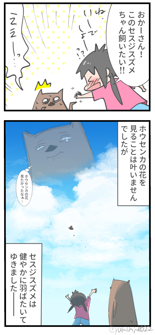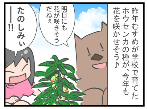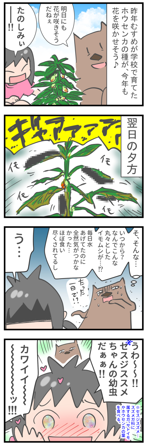 ホウセンカ育ててたつもりだったのに 2024年08月19日 こんにちは。昨年むすめが学校から持ち帰ってきたホウセンカの種を今年また植えましてね。種をまいた本人(ゆぴこ)はすでに忘れてるっぽくて結局私がお世話してたんですが、その甲斐あってカワイイ蕾をつけてくれたんですよ!赤い花びらもちょっと見えてて早ければ明日にで ... 続きを読む こんにちは。昨年むすめが学校から持ち帰ってきたホウセンカの種を今年また植えましてね。種をまいた本人(ゆぴこ)はすでに忘れてるっぽくて結局私がお世話してたんですが、その甲斐あってカワイイ蕾をつけてくれたんですよ!赤い花びらもちょっと見えてて早ければ明日にでも開花するかな?とむすめと一緒にワクワクしていたんですが…※(一応モザイク入れてますが虫苦手な方はご注意くだされ)いやぁ、たまげました。イモムシの成長スピード半端ないすね!前日もお水あげてたのに全く気付かなかった。多分すでにその時もいたんでしょうけど、たった1日で人差し指サイズの黒々としたイモムシになるなんてな~。気付いた時にはすでにホウセンカはほぼ丸裸だもん。結局ホウセンカの花を見ることなく枯れてしまいました。トホーガッカリしてる私をよそに、ガ(イモムシ)が大好きなむすめは興味の対象をホウセンカからイモムシへシフト。子どもの順応力の早さよ。私もむすめの影響でホシホウジャクの飼育とかして結構蛾が好きになってたんですけど、やっぱ大量のイモムシを目にすると動揺しますね…。てか、子どもの頃は平気で虫つかんだりできてたのに、大人になるとなんでできなくなるんでしょうね。ふしぎーライブドアアプリでの読者登録していただけますと幸い。(私のわかりにくい説明にもかかわらず登録してくださってる皆様、本当にありがとうございます…!)ブログ内のQRコードからも登録できるみたいです。人気ブログランキングポチッとしていただけたら歓喜。X(旧twitter)にて娘のその日印象に残った言葉を1コマ漫画にしてほぼ日(あんまできてないけど…)更新しとります。よかったら(^◇^) タグ :#育児漫画#蛾#ホウセンカ