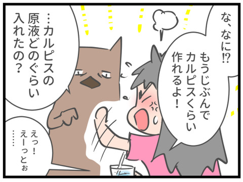 むすめ、カルピスを作る 2024年08月24日 こんにちは。夏になるとカルピスのCMがこれでもかっていうくらい流れてきて、もはや風物詩的なイメージありますよね。以前はよく飲んでいたんですが、最近は甘い飲み物は控えてたこともあってめっきり飲まなくなっていました。ですが先日、ふと久々に飲みたいな~と思い立ち ... 続きを読む こんにちは。夏になるとカルピスのCMがこれでもかっていうくらい流れてきて、もはや風物詩的なイメージありますよね。以前はよく飲んでいたんですが、最近は甘い飲み物は控えてたこともあってめっきり飲まなくなっていました。ですが先日、ふと久々に飲みたいな~と思い立ちまして希釈タイプを購入。むすめと飲んでみましたよ。予感はしていたんだけどまさか朝イチでやらかしてるとは。コップ半分ぐらい(もしかしたらそれ以上?)ぶっこんでるんですもの…ほぼ原液じゃないの。前日のうちに言っておけばよかった。でもカルピスの自分にちょうどいい割合ってこういう失敗を重ねて発見していくものなのかも。私も子どものころよく濃い目に作って水を足しながら飲んだりしてたしなー。あ、ちなみに私が子どものころの希釈タイプは瓶だったんでめちゃくちゃ手がべたべたになったんですよね。それもまたいい思い出…(遠い目)。ライブドアアプリでの読者登録していただけますと幸い。(私のわかりにくい説明にもかかわらず登録してくださってる皆様、本当にありがとうございます…!)ブログ内のQRコードからも登録できるみたいです。人気ブログランキングポチッとしていただけたら歓喜。X(旧twitter)にて娘のその日印象に残った言葉を1コマ漫画にしてほぼ日(あんまできてないけど…)更新しとります。よかったら(^◇^) タグ :#育児漫画#カルピス#夏の思い出