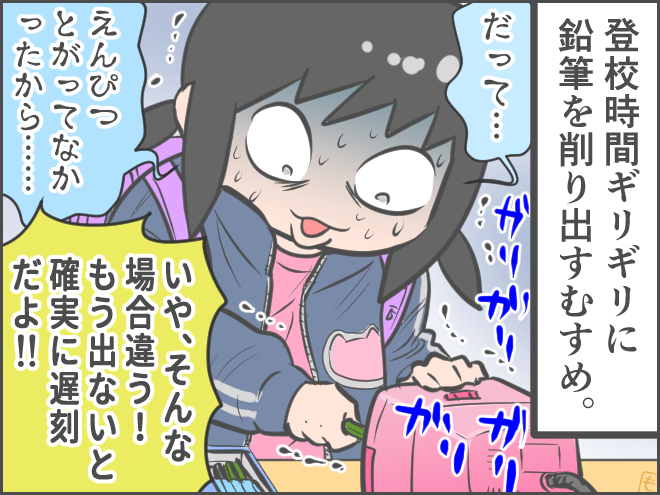 私が「いま〇分だよ!」ってカウントダウンしてるにもかかわらずプルプルしながら鉛筆を削りだすむすめ。なんで今!?学校でやんなさいよって思うけど、削らなければいけないむすめなりの理由があるんでしょう。