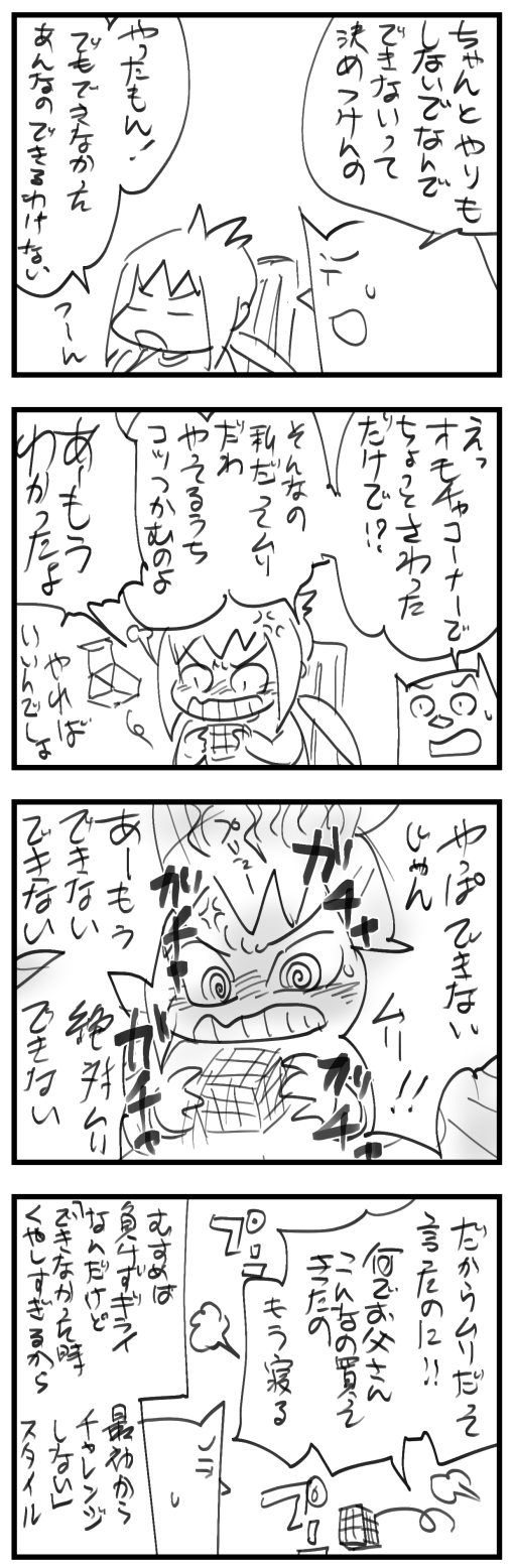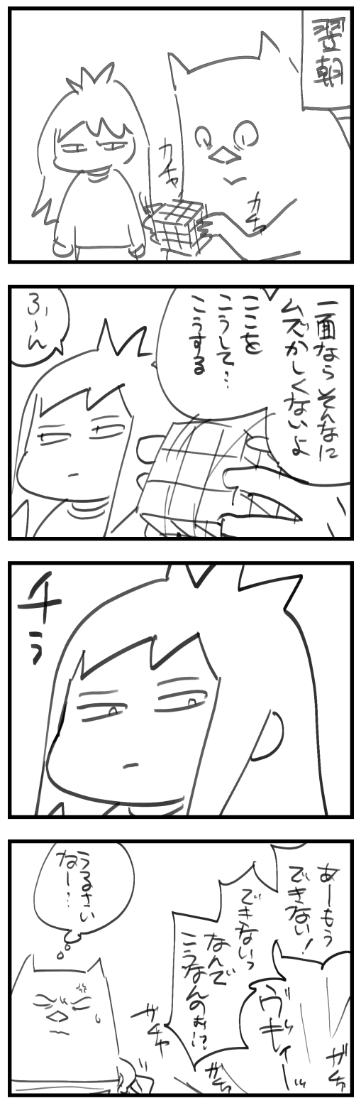朝もルービックキューブに触ろうともしないから私が手元見せて説明しながらやってみせたのにやっぱり文句ばっかりでケンカに。