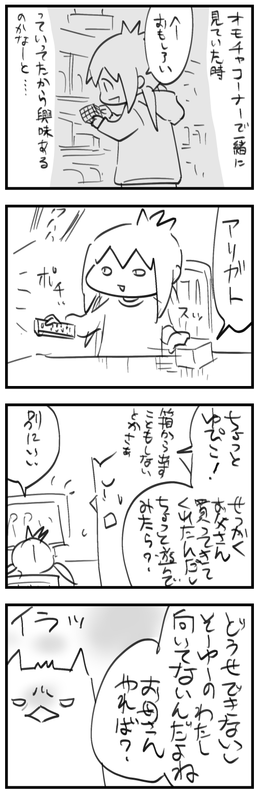 むすめはおそらく玩具コーナーのサンプル試したときにできなくて悔しくて、もういい忘れようって思っていたところにプレゼントされて「なんでー!?」ってなっちゃったんでしょうね。