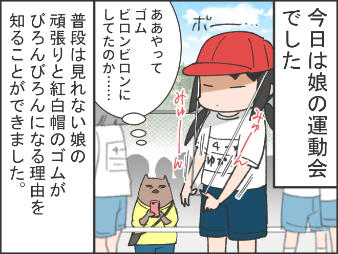 【むすめの1コマ近況】今日はむすめの運動会でした 2024年05月25日 こんにちは。今日はむすめの学校の運動会でした。晴天にも恵まれ絶好の運動会日和。仕事で来れなかった夫のためにもむすめの頑張る姿をバッチリおさめようとわたくし大奮闘でしたよ。むすめの家での甘えっ子とは違う「年上」としての一面を垣間見たり、仲間と協力してる姿に ... 続きを読む こんにちは。今日はむすめの学校の運動会でした。晴天にも恵まれ絶好の運動会日和。仕事で来れなかった夫のためにもむすめの頑張る姿をバッチリおさめようとわたくし大奮闘でしたよ。むすめの家での甘えっ子とは違う「年上」としての一面を垣間見たり、仲間と協力してる姿に成長を感じた運動会でした。直したと思ったら数日後にはビロンビロンになるむすめの紅白帽のゴム。本人は「なんでかしらない、気がつくとこうなってる。もっと強いゴムにしたらいいんじゃない?」とかすっとぼけてましたが、こんだけみょんみょんしてたらそらのびるわ。今日運動会だったお子様&ご家族様ほんとお疲れさまでした~!ライブドアアプリでの読者登録していただけますと幸い。(私のわかりにくい説明にもかかわらず登録してくださってる皆様、本当にありがとうございます…!)ブログ内のQRコードからも登録できるみたいです。人気ブログランキングポチッとしていただけたら歓喜。X(旧twitter)にて娘のその日印象に残った言葉を1コマ漫画にしてほぼ日(あんまできてないけど…)更新しとります。よかったら(^◇^) タグ :#育児漫画#運動会#小学生
