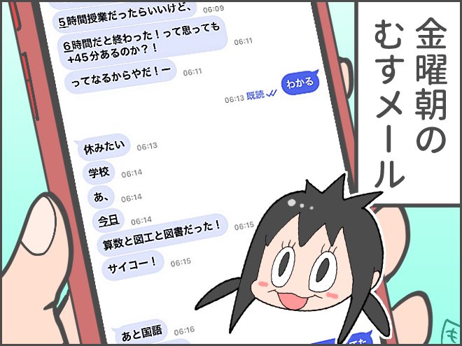 こんばんは。なんか最近更新が日付変わるギリギリになっちゃうな。今日は金曜日。むすめの疲れもピークだったみたいで、今朝はなかなか布団から起きだしてこないなと思ったらキッズケータイから私の携帯にイヤイヤメールがきました。登校を嫌がるむすめになんて答えたらいい ...