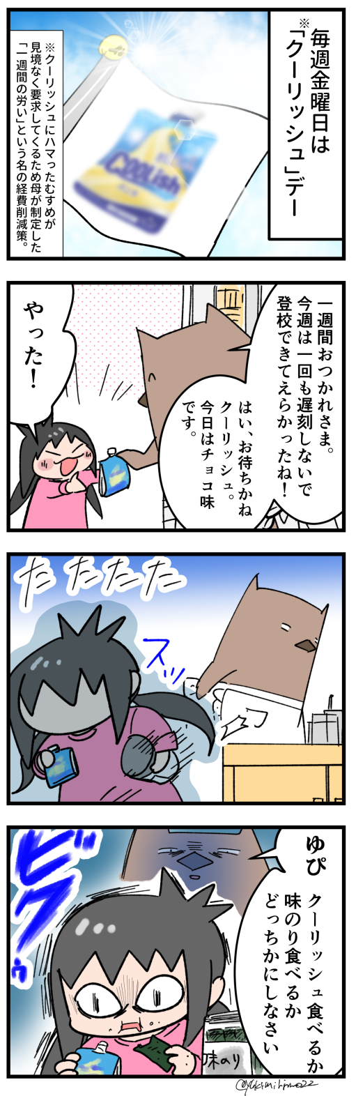 最初の頃はよく買ってきてあげてたんですが、なんか冷凍庫に常にある事に気付いたっぽくて学校帰ると居酒屋の常連客のノリで「とりあえずクーリッシュ」とか要求してくるので、プレミア感を持たせるため毎週金曜日を「クーリッシュの日」と決めてご褒美としてあけることにしました。